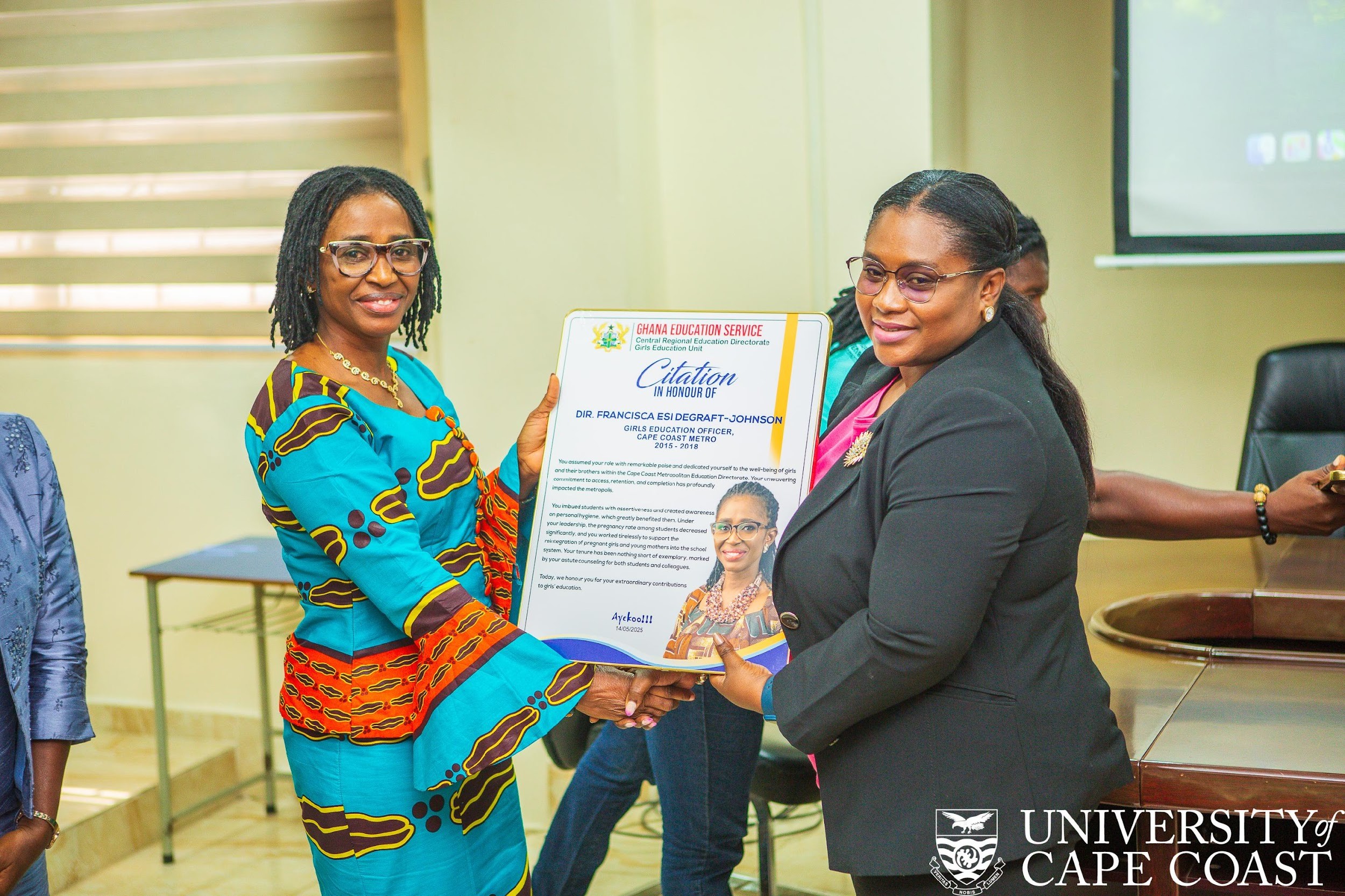 Director of CEGRAD-UCC, Prof Eunice Fay Amissah (R), presenting a citation of honour to a retired GES Girls Education Officer