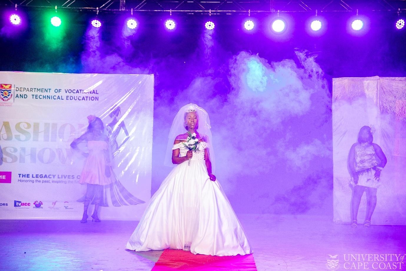 A student modelling a bridal gownSpeaking at the event, an Associate Professor of Industrial and Organisational Psychology at UCC, Prof. Lebbaeus Asamani, underscored that the fashion show vividly demonstrated the students' mastery of competency-based training. While urging the young designers to leverage creative designs to promote Africa, he also commended them and asked them to build upon their work to improve the positive impact of the fashion industry in Ghana.The Head of Department of VoTEC, Dr. Manasseh E Komla Amu, said for over a decade, the event had been a celebration of the powerful intersection between fashion, culture and music.